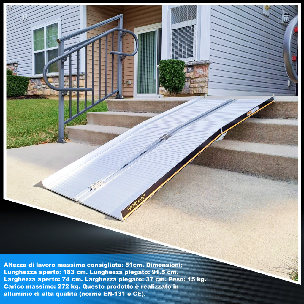 Questa rampa si ripiega molto facilmente (due volte: in lunghezza e in larghezza)., Superficie resistente e antiscivolo anche in caso di pioggia o pioggia., Prodotto durevole nel tempo., Materiale: alluminio anodizzato di alta qualità., Design ottimizzato, solido e unico. Molto pratico per la manipolazione o il trasporto e lo stoccaggio.
