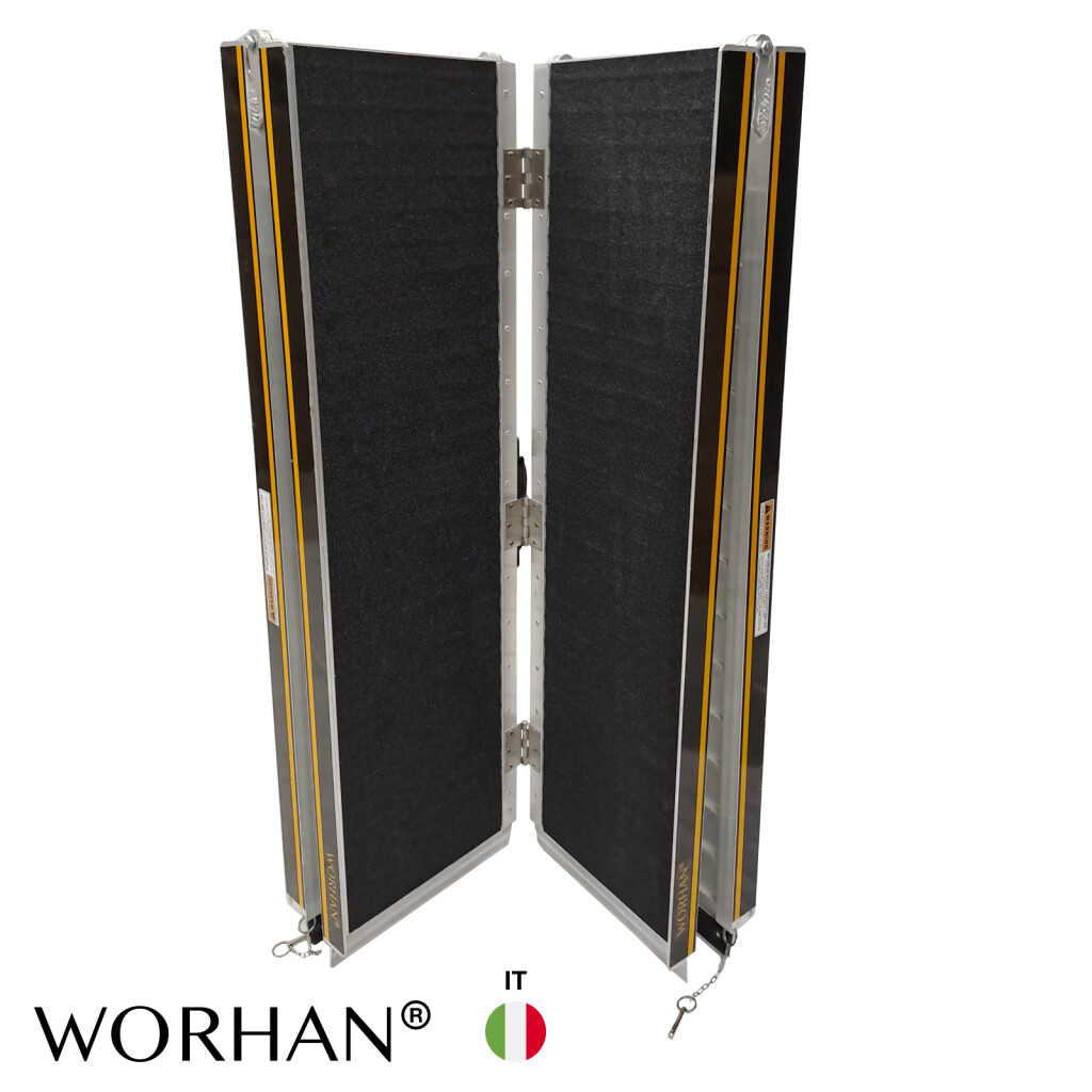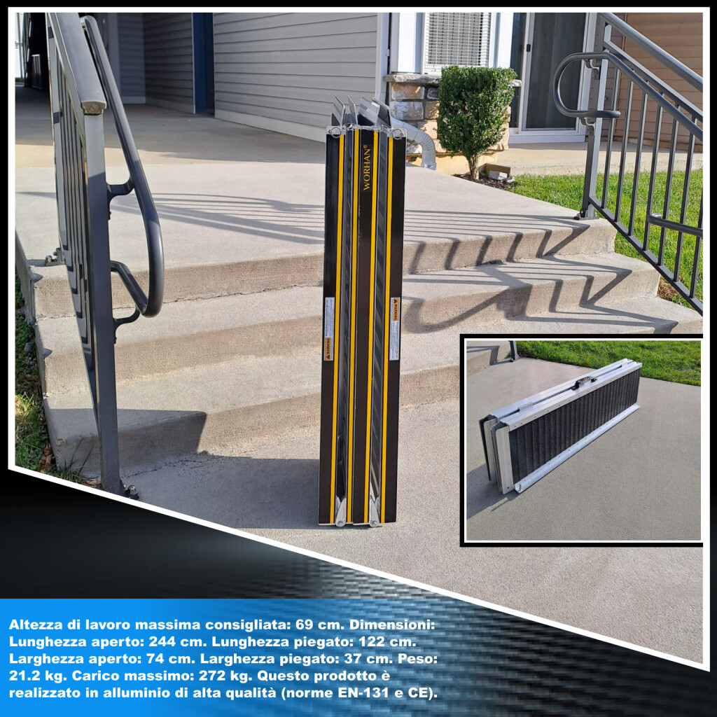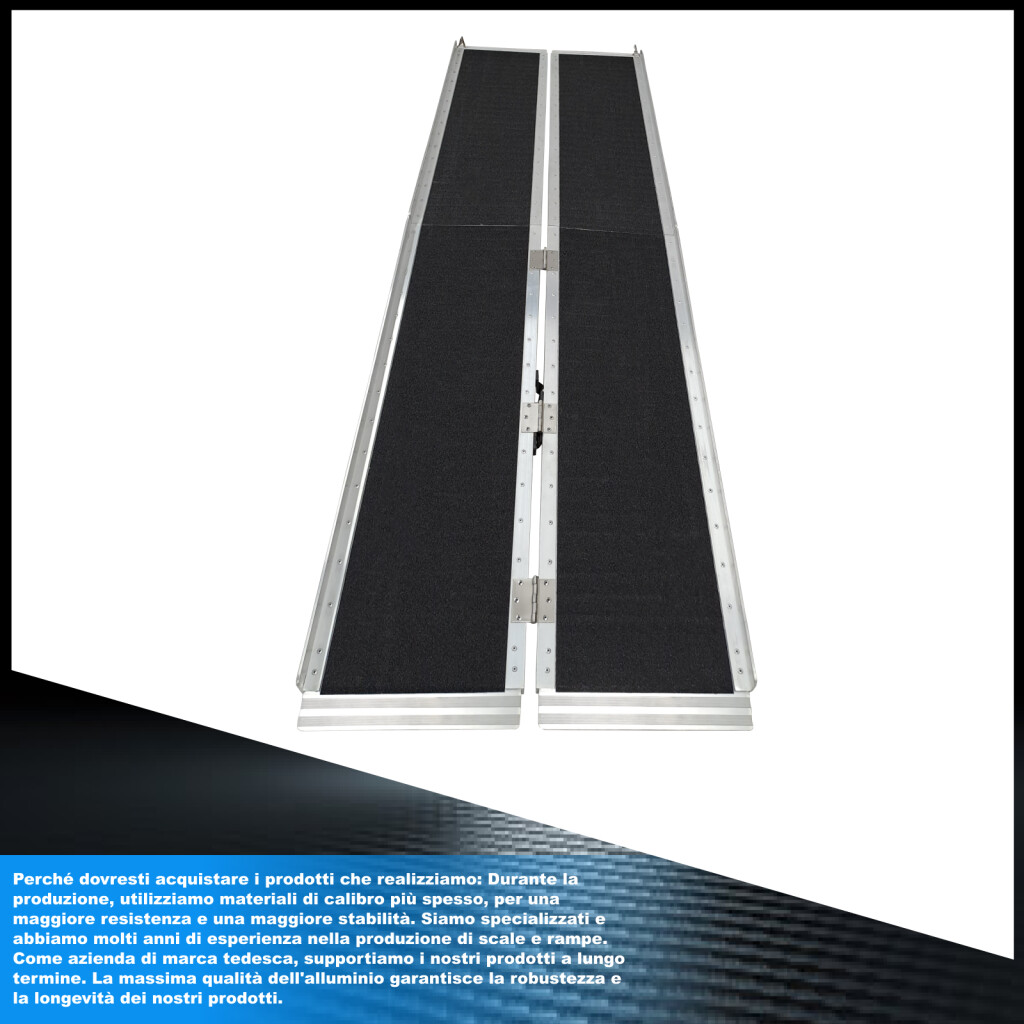 Elevata funzione antiscivol., Questa rampa si ripiega molto facilmente (due volte: in lunghezza e in larghezza)., Superficie resistente e EXTRA antiscivolo anche in caso di pioggia o pioggia., Prodotto durevole nel tempo., Materiale: alluminio anodizzato di alta qualità., Design ottimizzato, solido e unico. Molto pratico per la manipolazione o il trasporto e lo stoccaggio.