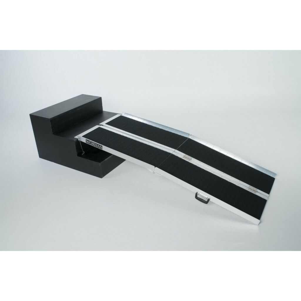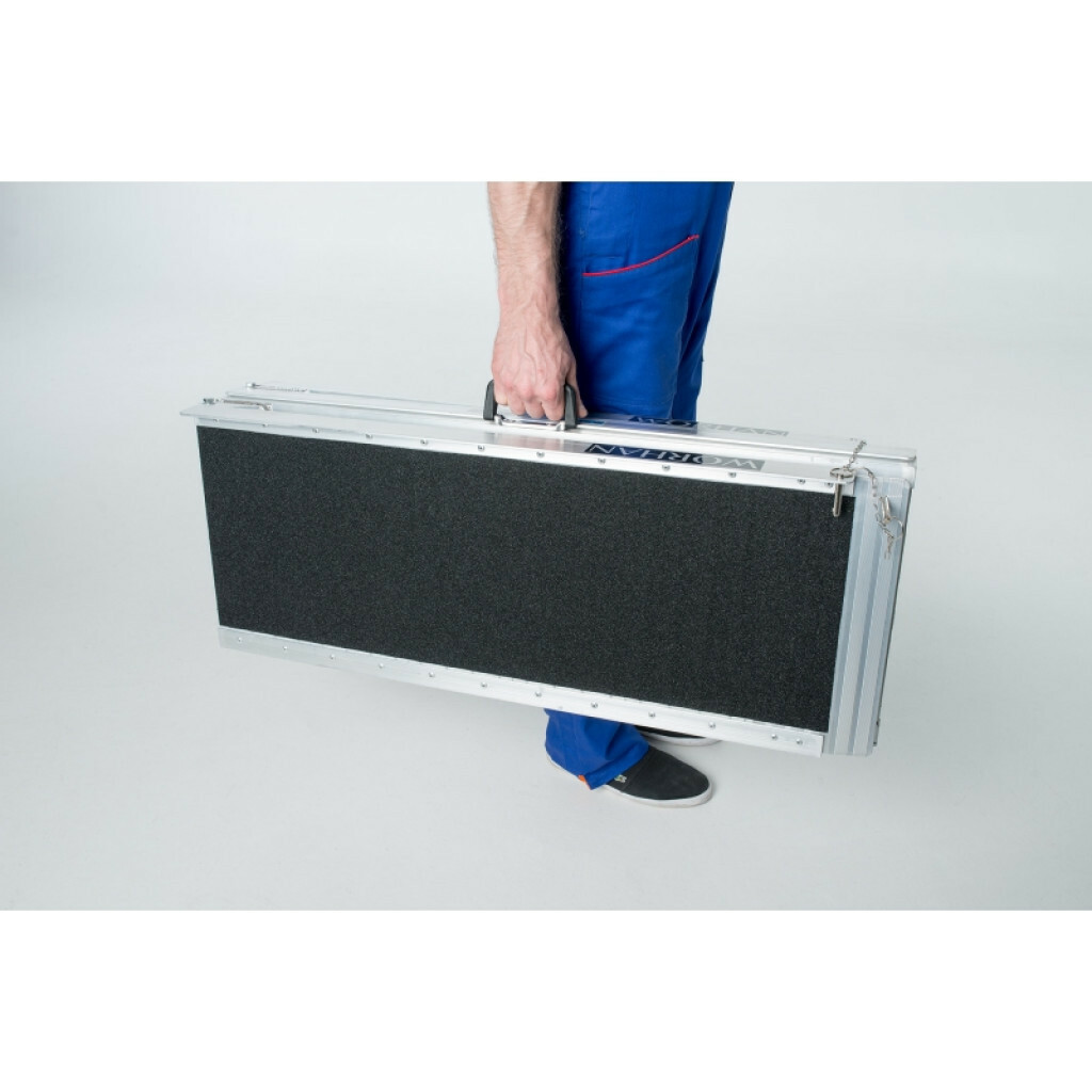 Elevata funzione antiscivol., Questa rampa si ripiega molto facilmente (due volte: in lunghezza e in larghezza)., Superficie resistente e EXTRA antiscivolo anche in caso di pioggia o pioggia., Prodotto durevole nel tempo., Materiale: alluminio anodizzato di alta qualità., Design ottimizzato, solido e unico. Molto pratico per la manipolazione o il trasporto e lo stoccaggio.