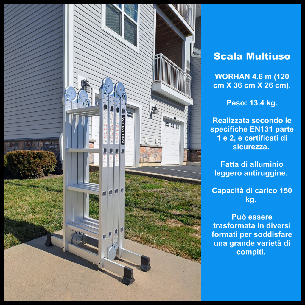 Altezza: 460cm., Altezza in posizione scaletta: 220cm., Gradini: 4x4., Dimensioni chiuso: 120cm x 36cm x 26cm., Peso: 13.4kg.