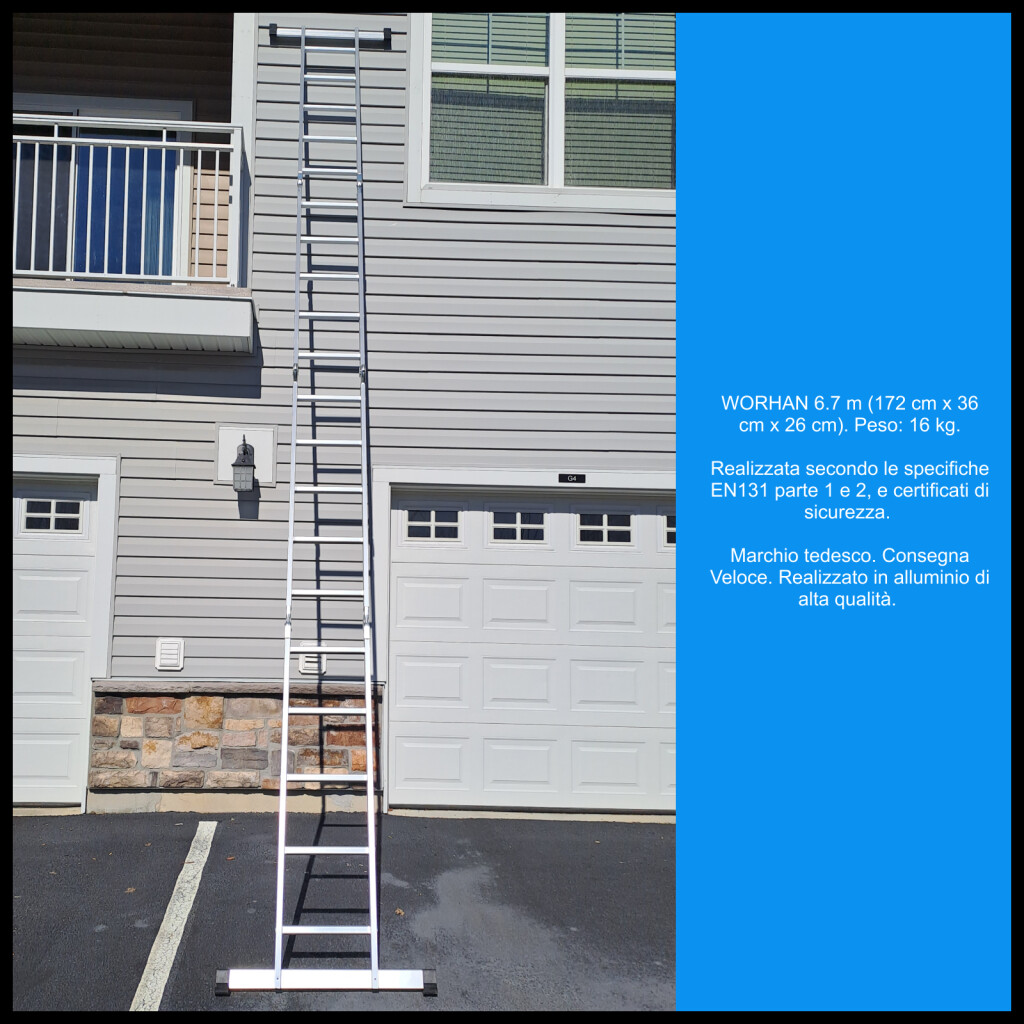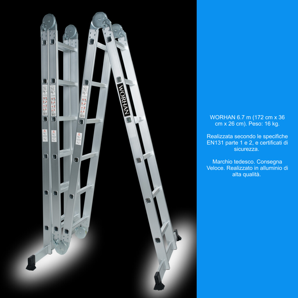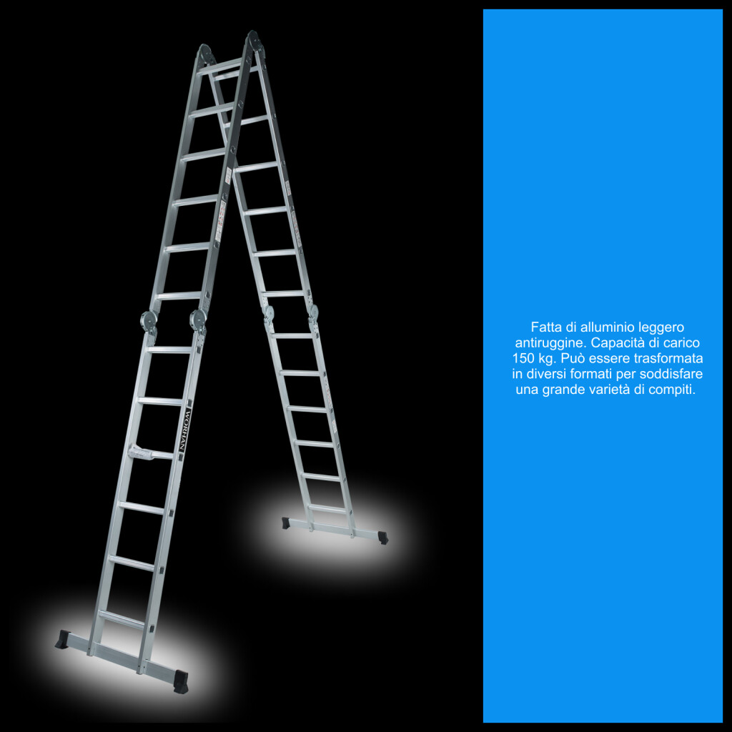 Prodotto rigorosamente secondo gli standard di sicurezza EN131., Materiali: alluminio anodizzato Peso massimo: 150 kg., Gradini speciali antiscivolo a coste., Meccanismo di bloccaggio facile da usare.