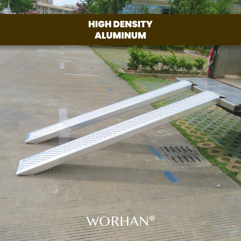 The product is made of high quality aluminum according to EN and CE standards. Being made of aluminium, they are extremely light (8.5kg each), very robust and cannot rust. Surface: perforated - non-slip, for excellent grip. Product details and dimensions: Weight - 8.5kg (17kg per pair).,Length - 200cm., Width - 256mm., Depth - 65mm., Maximum load weight - 1000kg (per pair). GERMAN BRAND. EXCEPTIONAL CUSTOMER SERVICE. The ramps could be used to load tractors or lawnmowers, Quad ATVs, trailers, electric bikes, motorcycles etc etc. Beveled side edges to ensure increased contact at the upper fulcrum. Why you should buy the products we manufacture: During manufacture, we use thicker gauge materials for greater strength and increased stability. We are specialized and have many years of experience in the production of ladders and ramps. As a German brand company, we stand behind our products in the long term. The highest quality aluminum guarantees the robustness and longevity of our products.