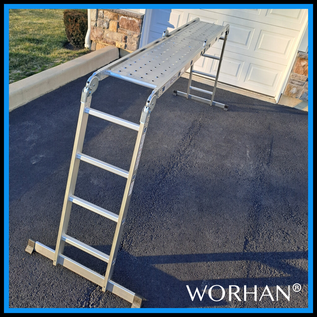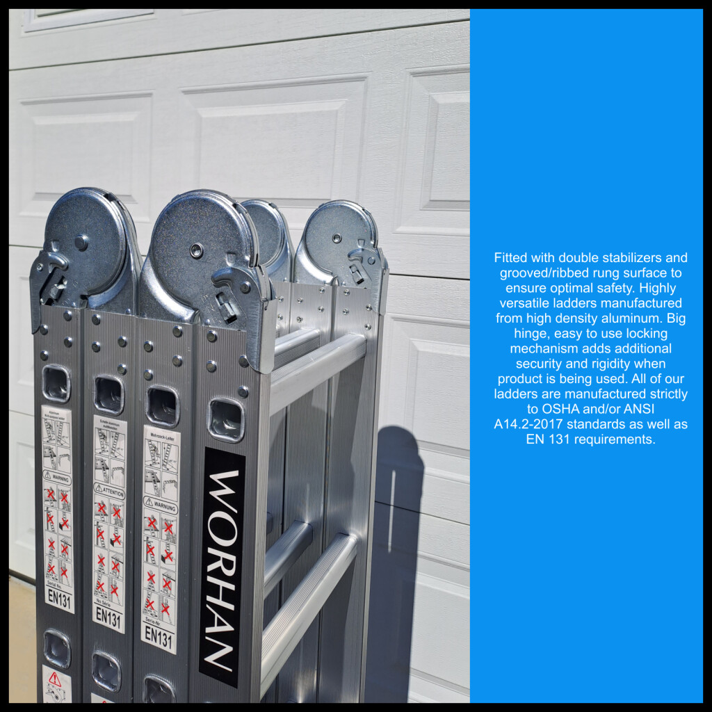 Fully extended length: 460cm., Step ladder height: 220cm., Rungs: 4x4., Folded size: 120cm x 36cm x 26cm., Weight: 18kg., Ladder comes with 2 aluminum platforms. German brand., Exceptional customer service. Manufactured strictly to EN131 safety standard., Material: Anodized aluminum., Maximum weight: 150kg., Special non-slip ribbed rungs., Easy to use locking mechanism. The BIG HINGE model., Extended Stabilizer Bar., Superior quality and stability., Very durable ladders which have been manufactured from high quality aluminum., Hinge locking mechanism adds extra security and rigidity when using the ladder. Why you should buy our products ? We use thicker gauge materials for more strength and increased stability., We specialized and have many years of experience in the production of a ladders and ramps., As a German brand company , we stand behind our products in the long term., The highest quality aluminum guarantees the robustness and longevity of our products.
